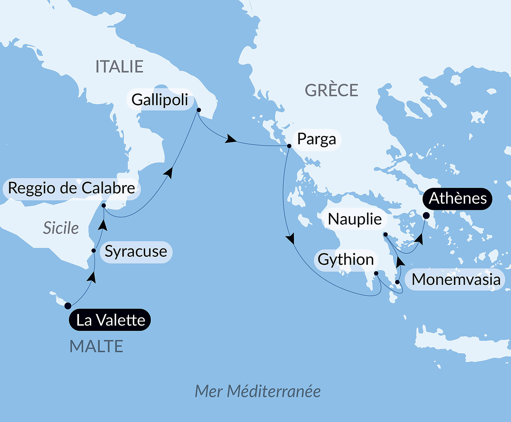 Il est temps de mettre le cap vers la Grèce. Le légendaire Péloponnèse vous plonge dans le tumultueux et glorieux passé du pays. Nauplie est loccasion de découvrir les mythiques sites dÉpidaure et de Mycènes, respectivement théâtre antique et cité préhellénique, tous deux classés à lUnesco. Monemvasia, joyau exhalant sa poésie et dévoilant son architecture vénitienne et byzantine se conjugue à leffervescence et au charme de Gythion, autrefois port de Sparte puis base navale romaine. En Épire, cest la découverte de Parga, baignée par la mer Ionienne qui vous transporte avec sa forteresse bâtie par les Normands au XIVe siècle surplombant son attrayant port de pêcheurs.